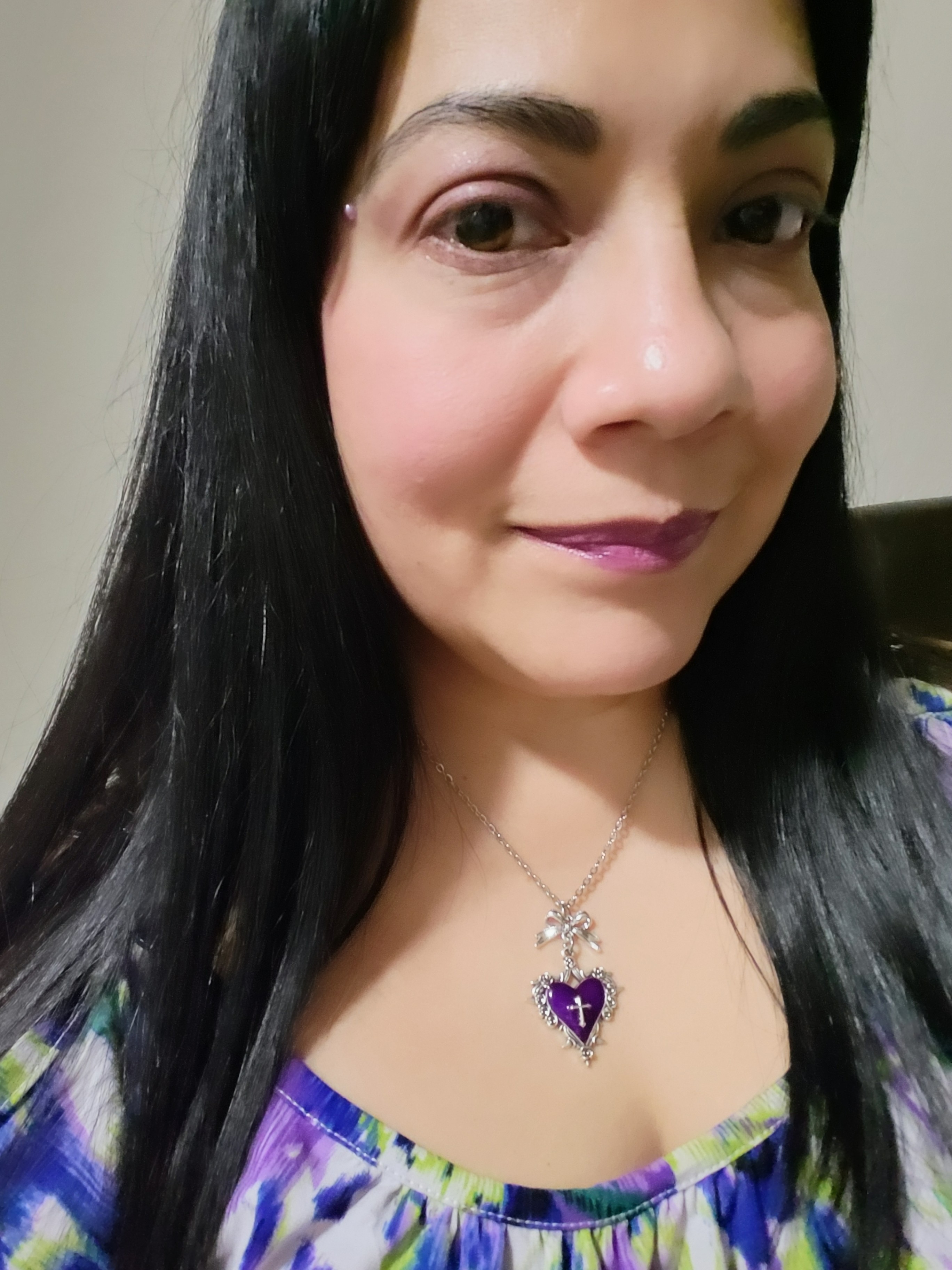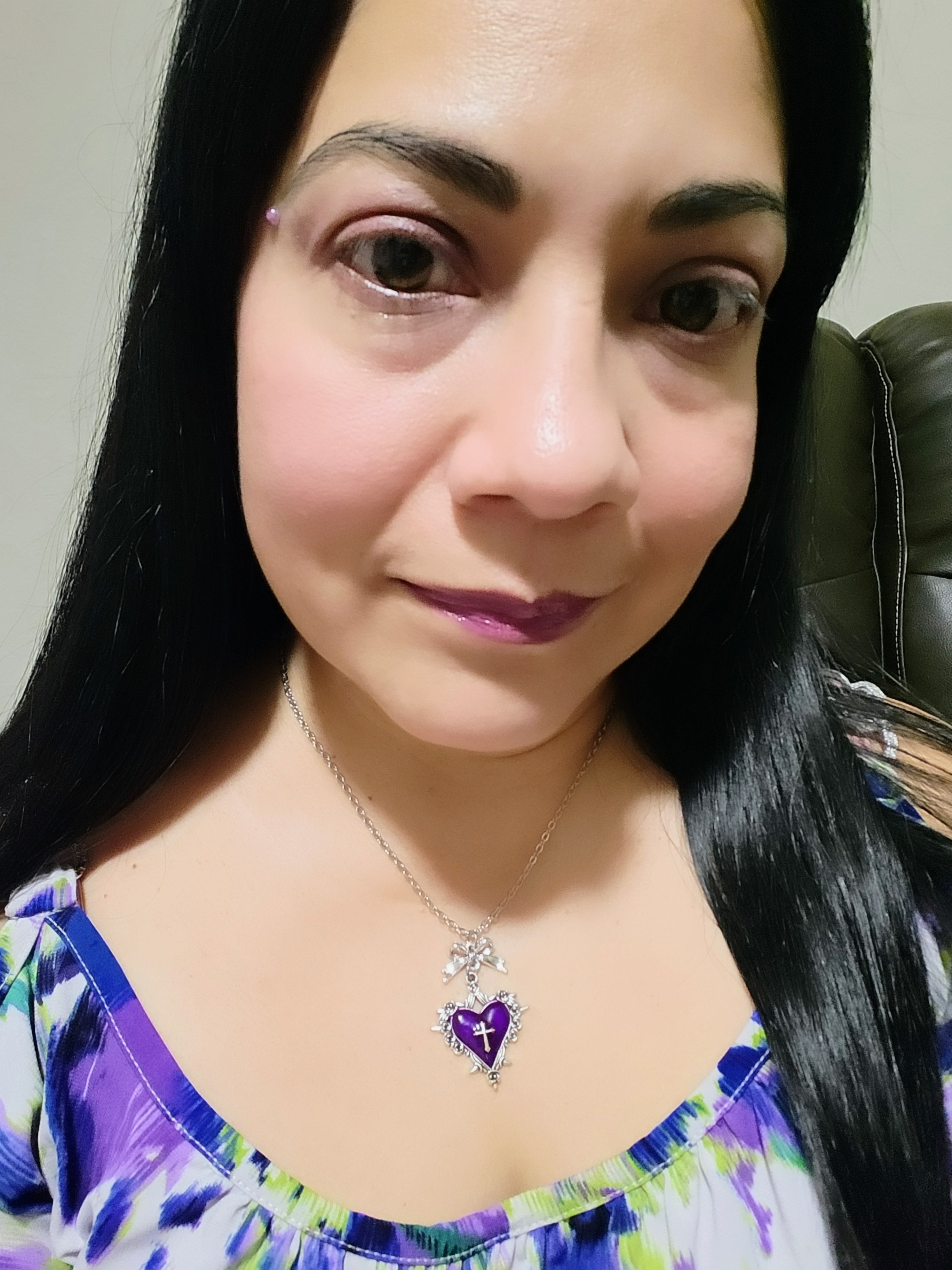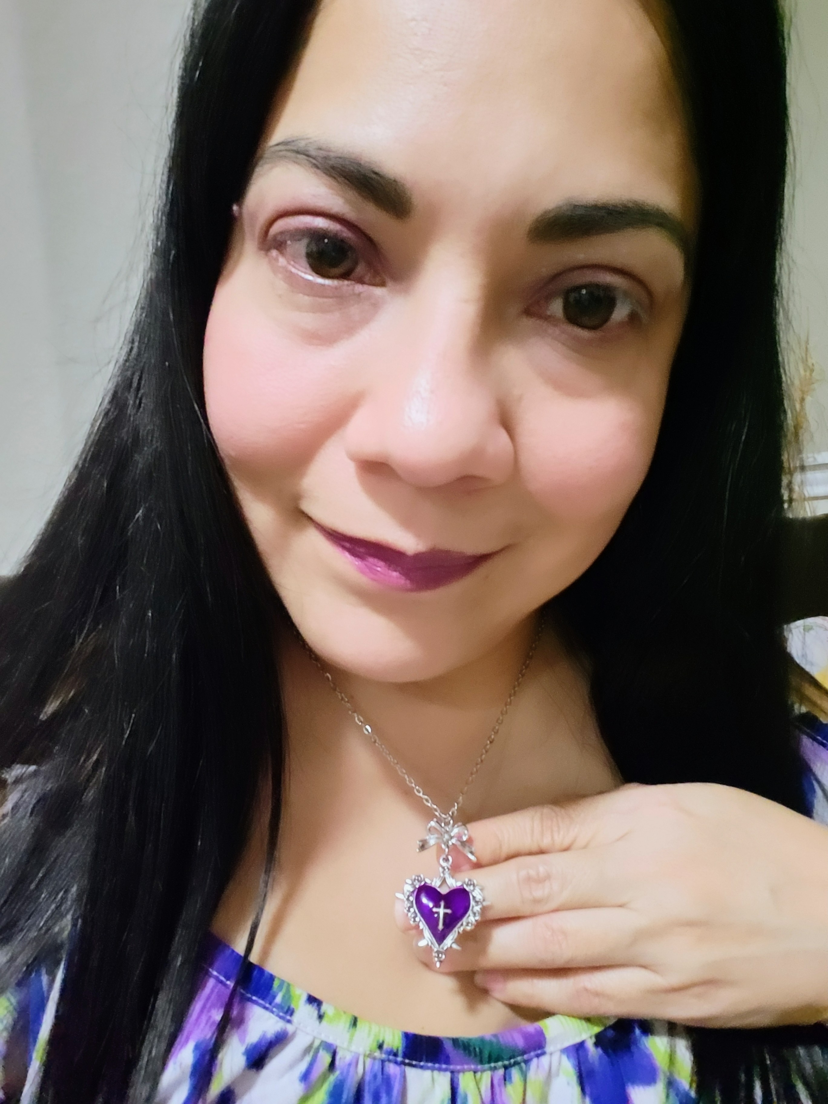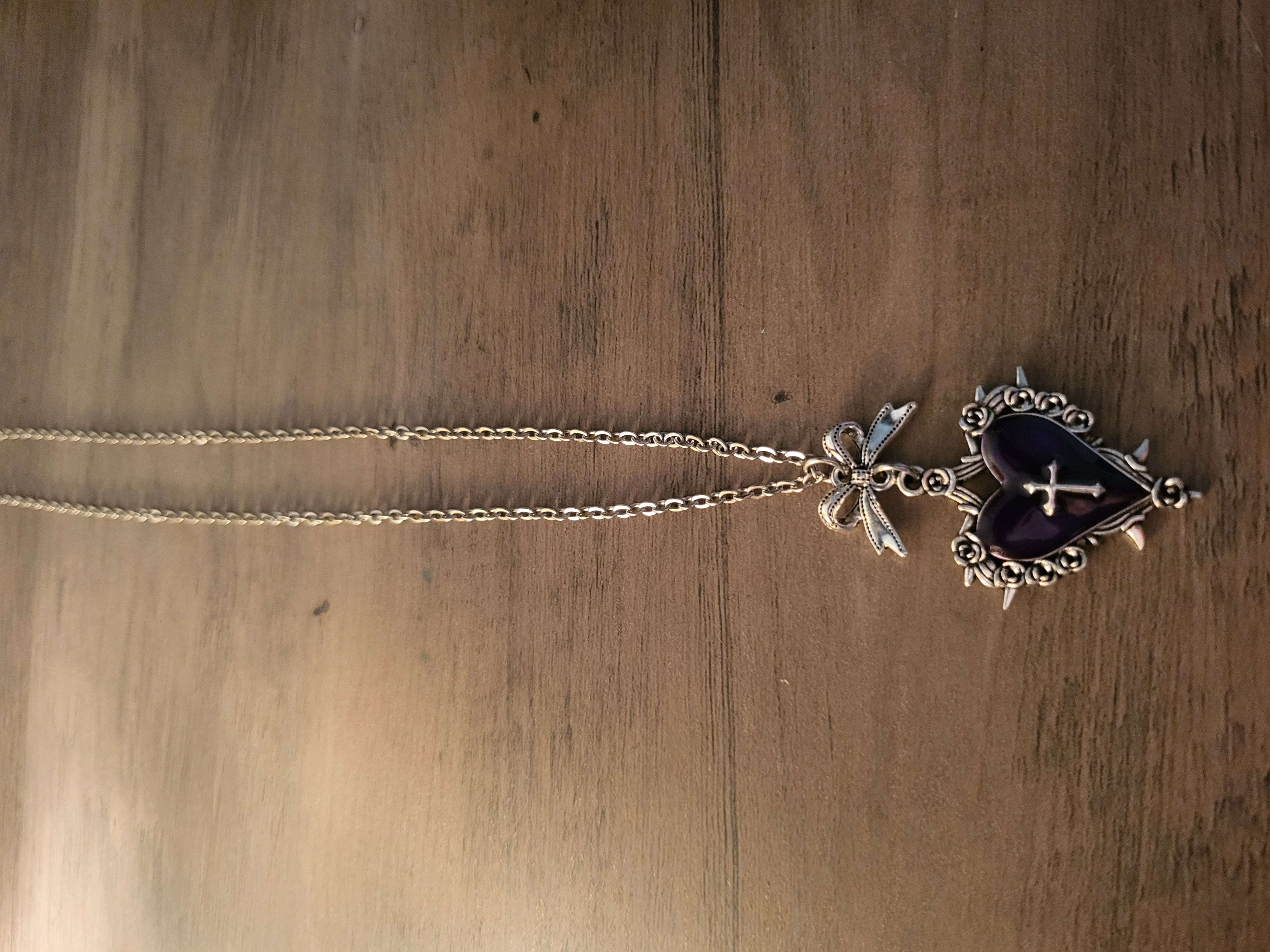 This unique necklace features a Purple Heart + Cross with small Spikes around the pendant. The silver chain brings elegance to this piece. Perfect for women seeking a distinctive and stylish accessory.