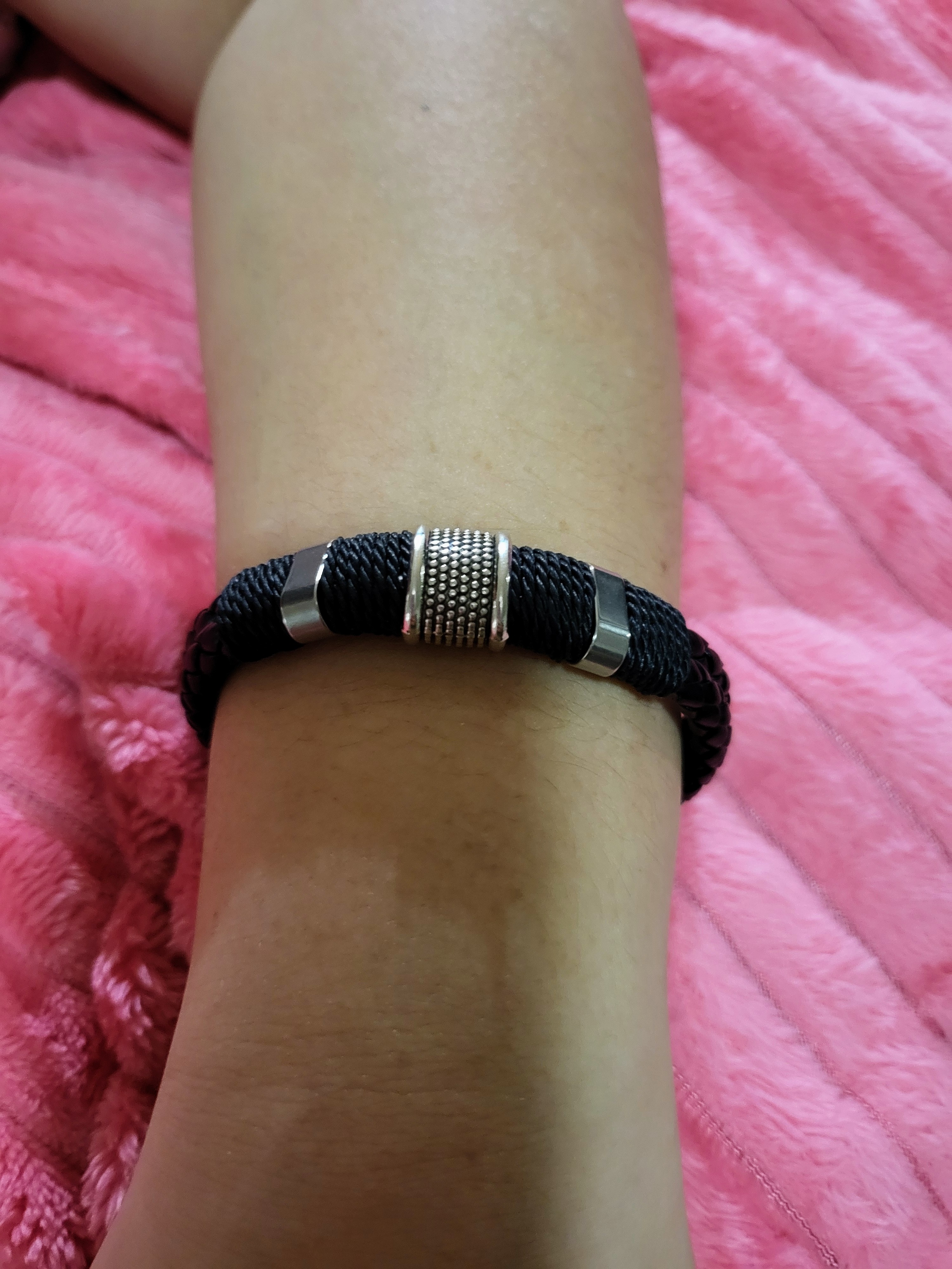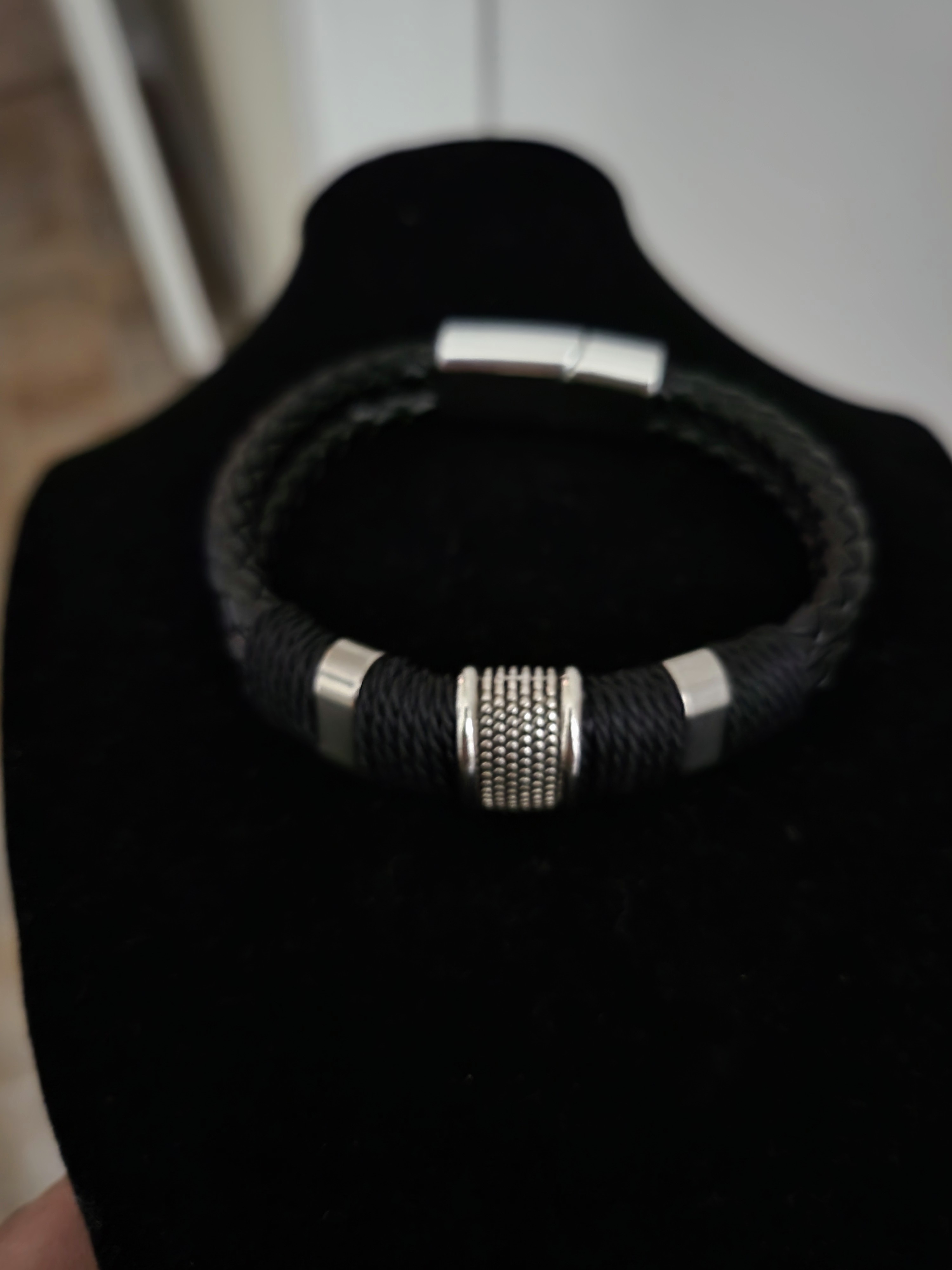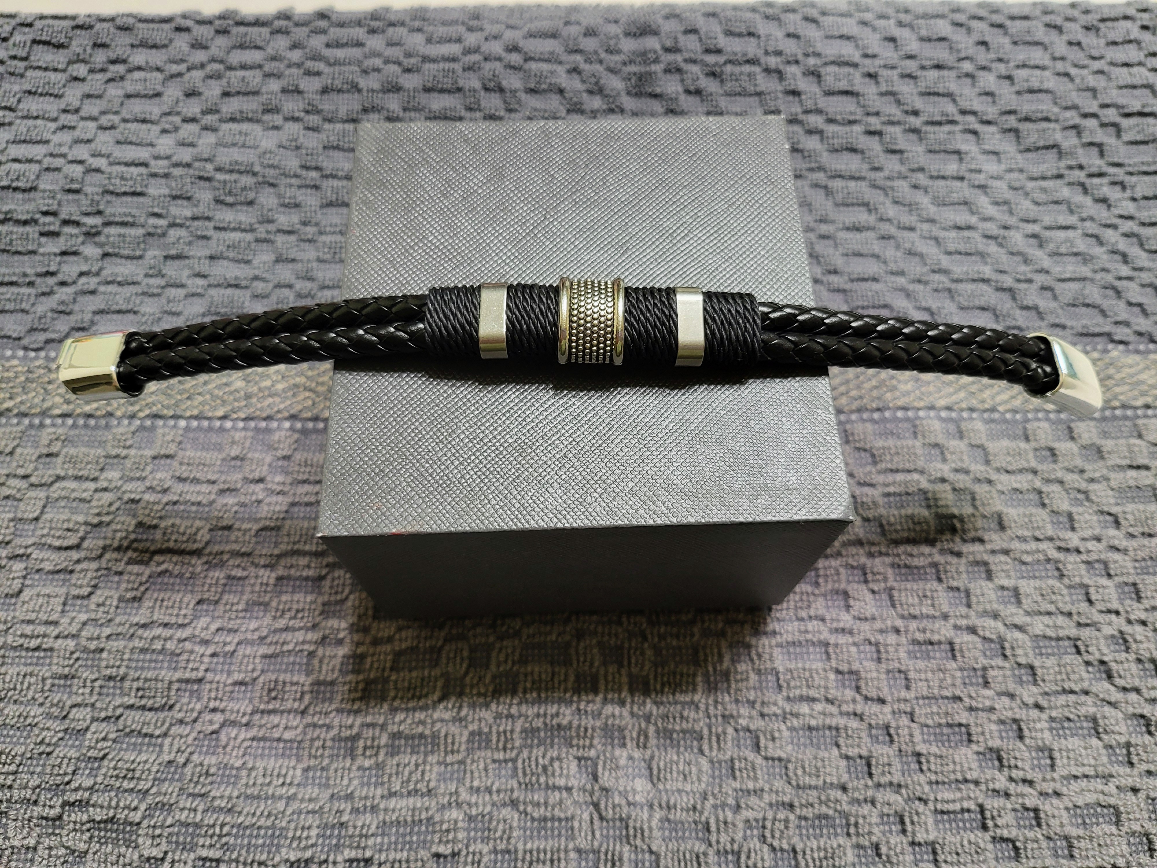 Men's Woven Leather Bracelet with Silver Accents and Magnetic Clasp for Everyday Wear.